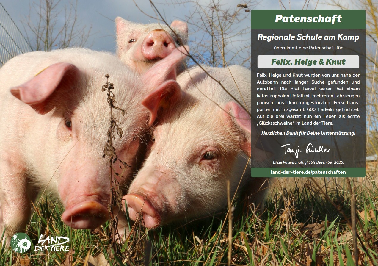 Die Schüler_innen der Kampschule entschieden sich für eine Patenschaft von 4 Glücksschweinen. Anbei seht ihr Felix, Helge, Knut und Eddie. Die Patenschaft wurde für 4000€ durch den Spendenlauf der Schule im Oktober finanziert.